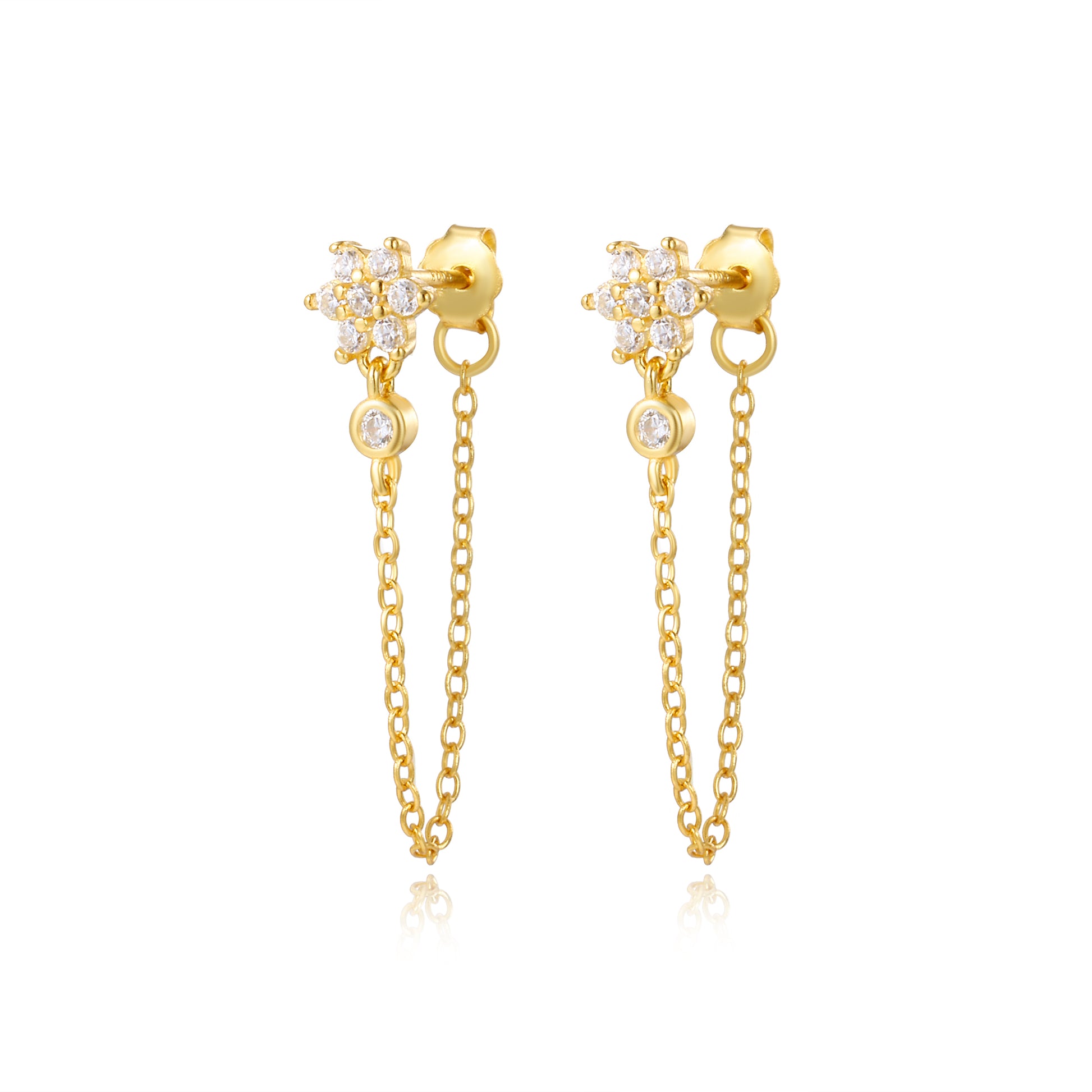 Enhance your ear game with the luxurious Agatha Sunflower Dangling Chain Stud Earrings. The sparkling flower design and delicate dangling chain add an elegant touch, while the butterfly closure creates a secure fit. Perfect for stacking with other earrings, these earrings are a must-have addition to your collection.