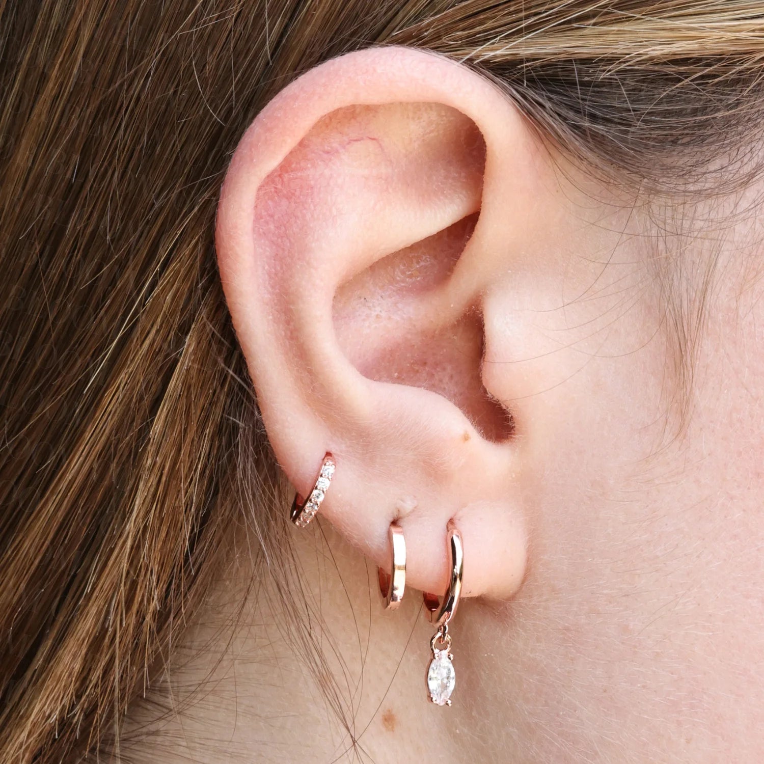 Transform any outfit with these versatile 9mm hoops, adorned with a delicate marquise gemstone charm. Elevate your style with these elegant and timeless earrings.