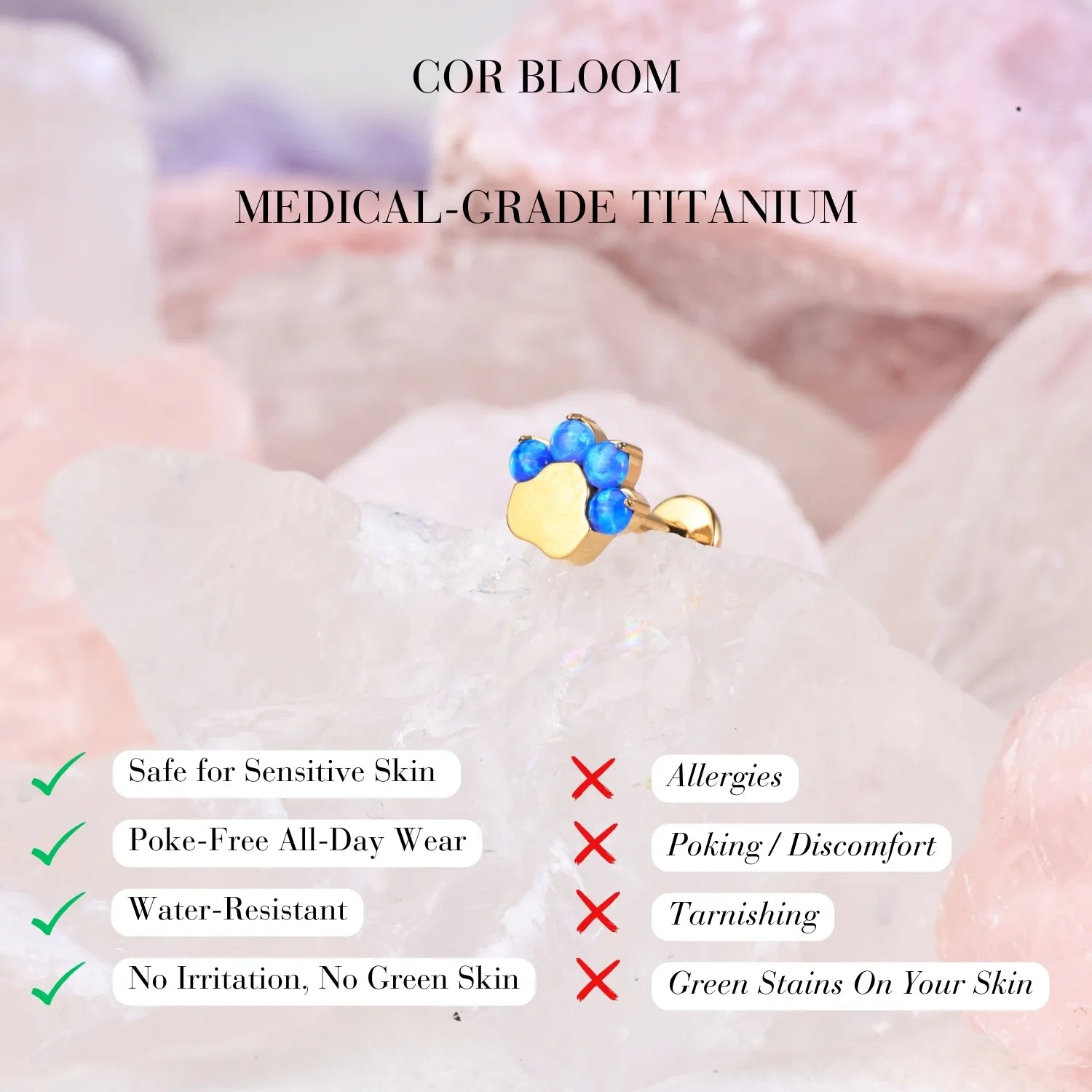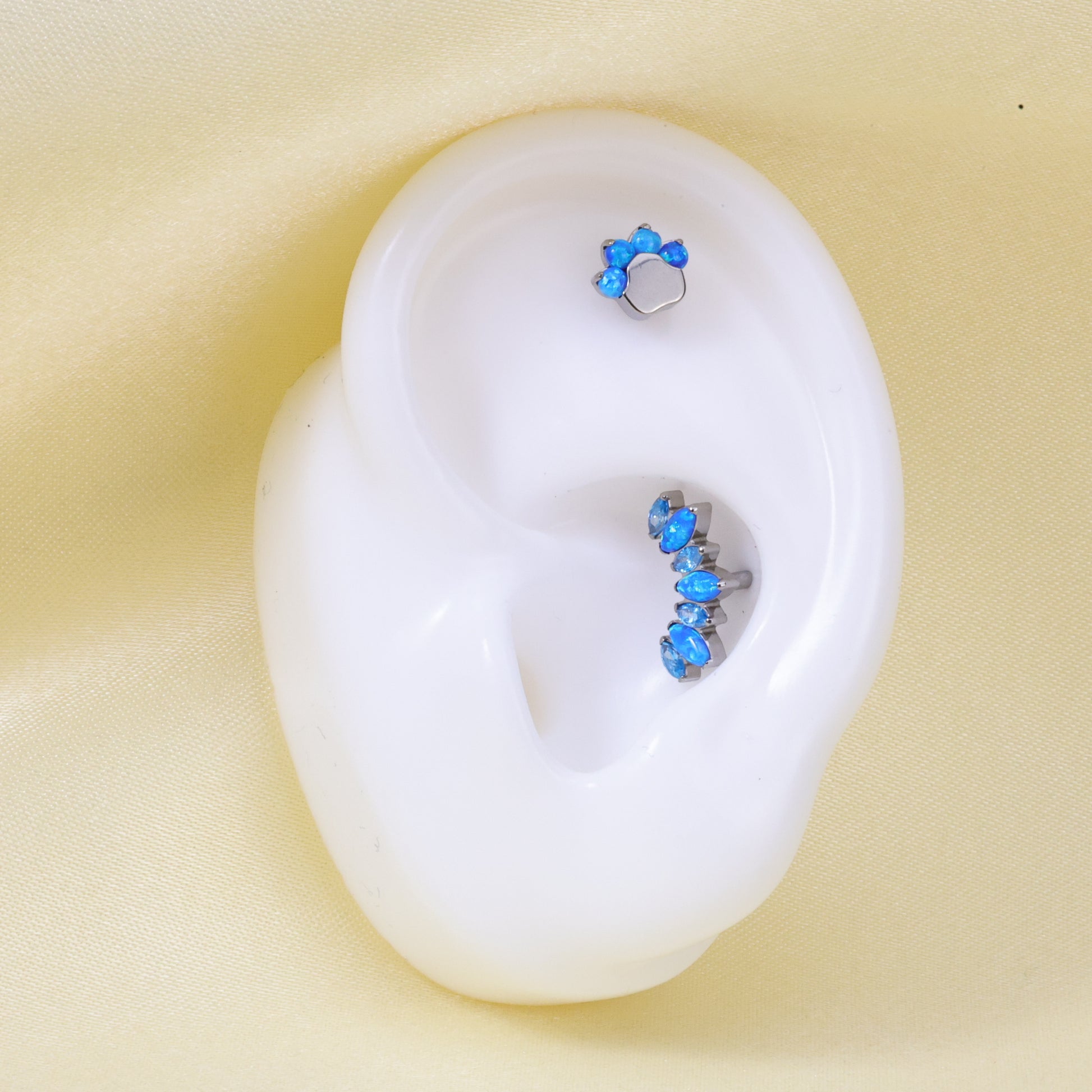 This sparkling G23 Titanium Blue Opal Paw Flat Back Earring will help you look fabulous without doing too much - waterproof, hypoallergenic, and made with long-lasting implant-grade material, wear this comfortable flat back earring to achieve an effortless look, this delicate yet durable accessory will also make a great gift for any piercing lover!