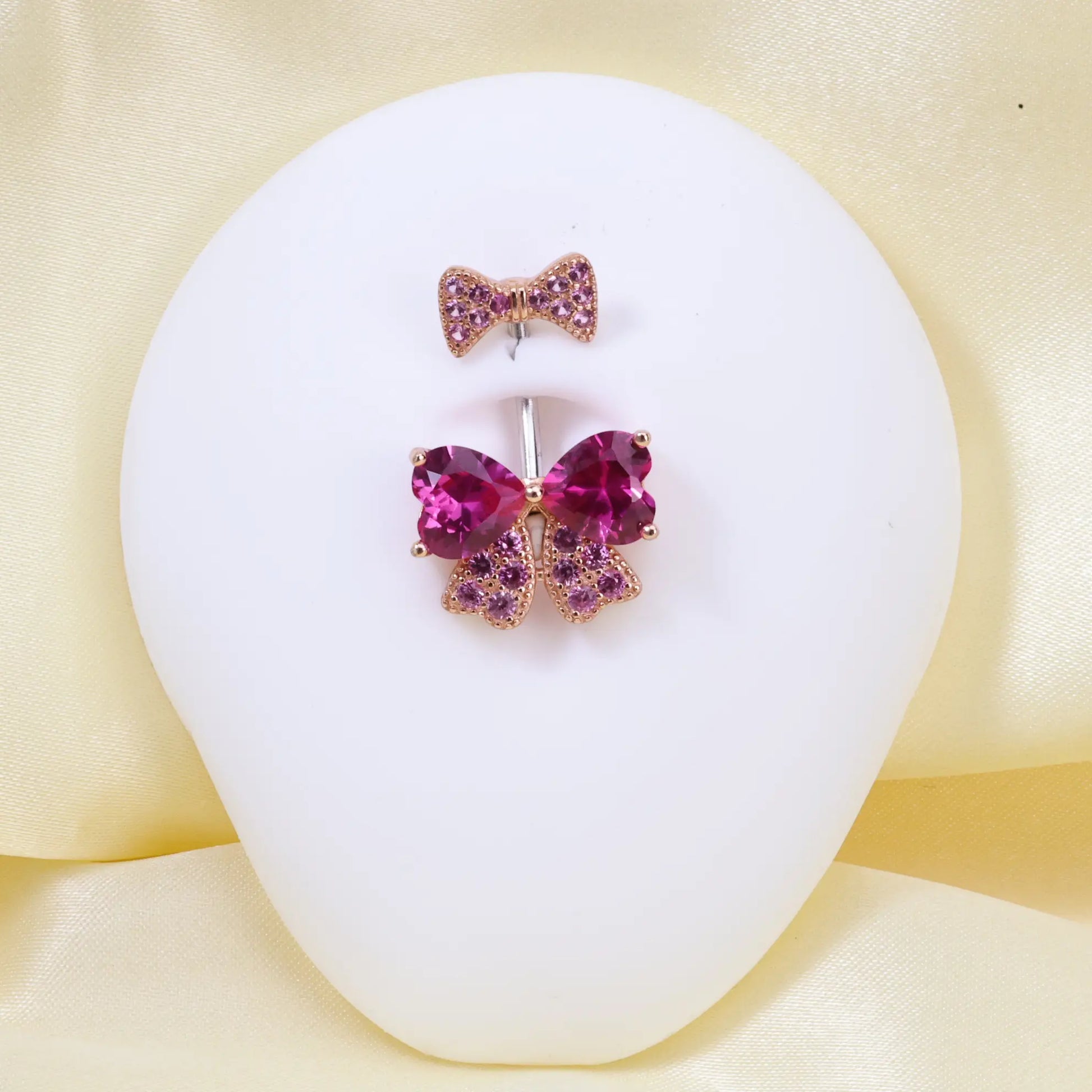 Add some whimsy to your look with the Rosy Butterfly Belly Button Ring! Featuring a bow tie design with sparkling gemstones and a statement butterfly, this hypoallergenic and water resistant navel ring is a playful and stylish addition to any outfit. (Butterfly kisses not included.)