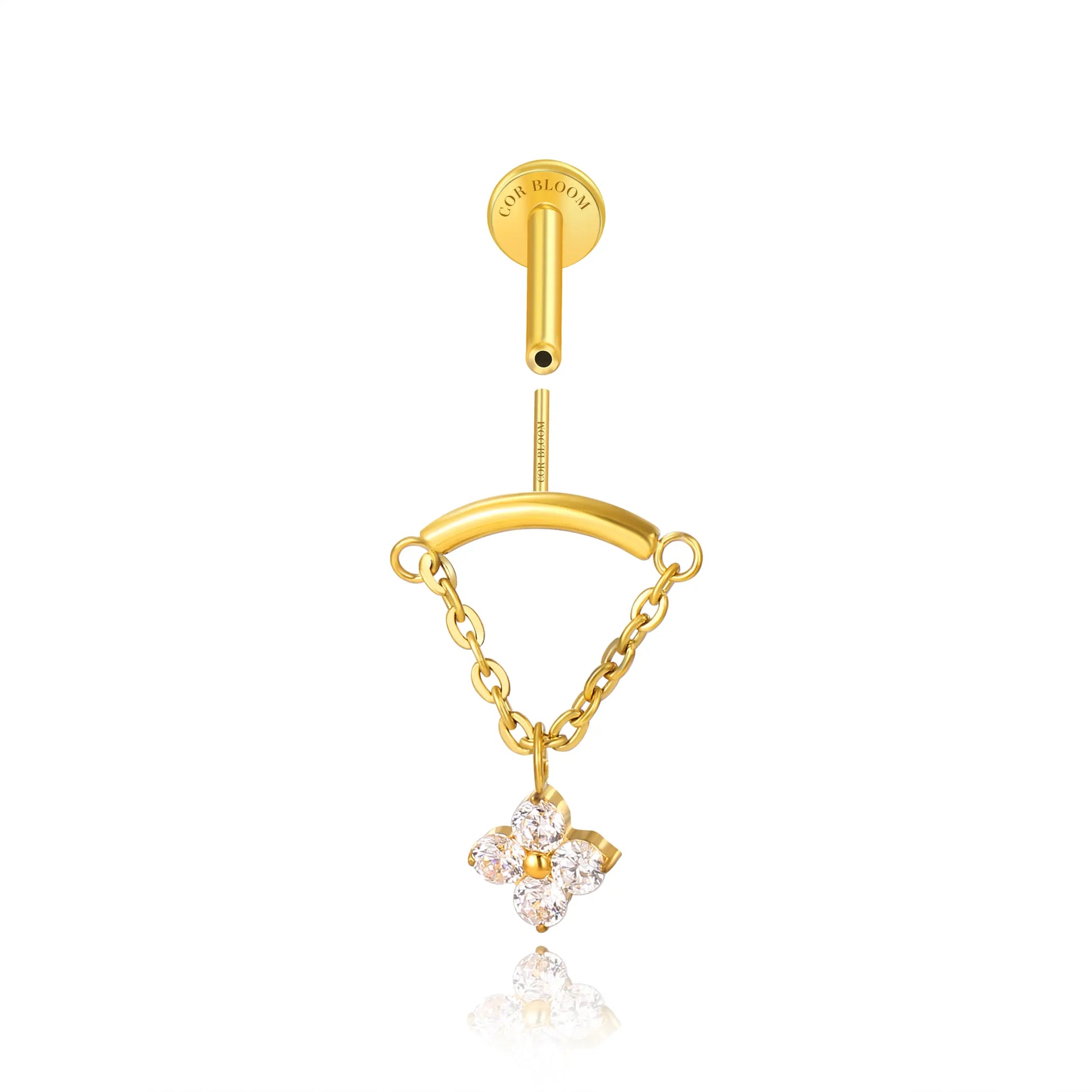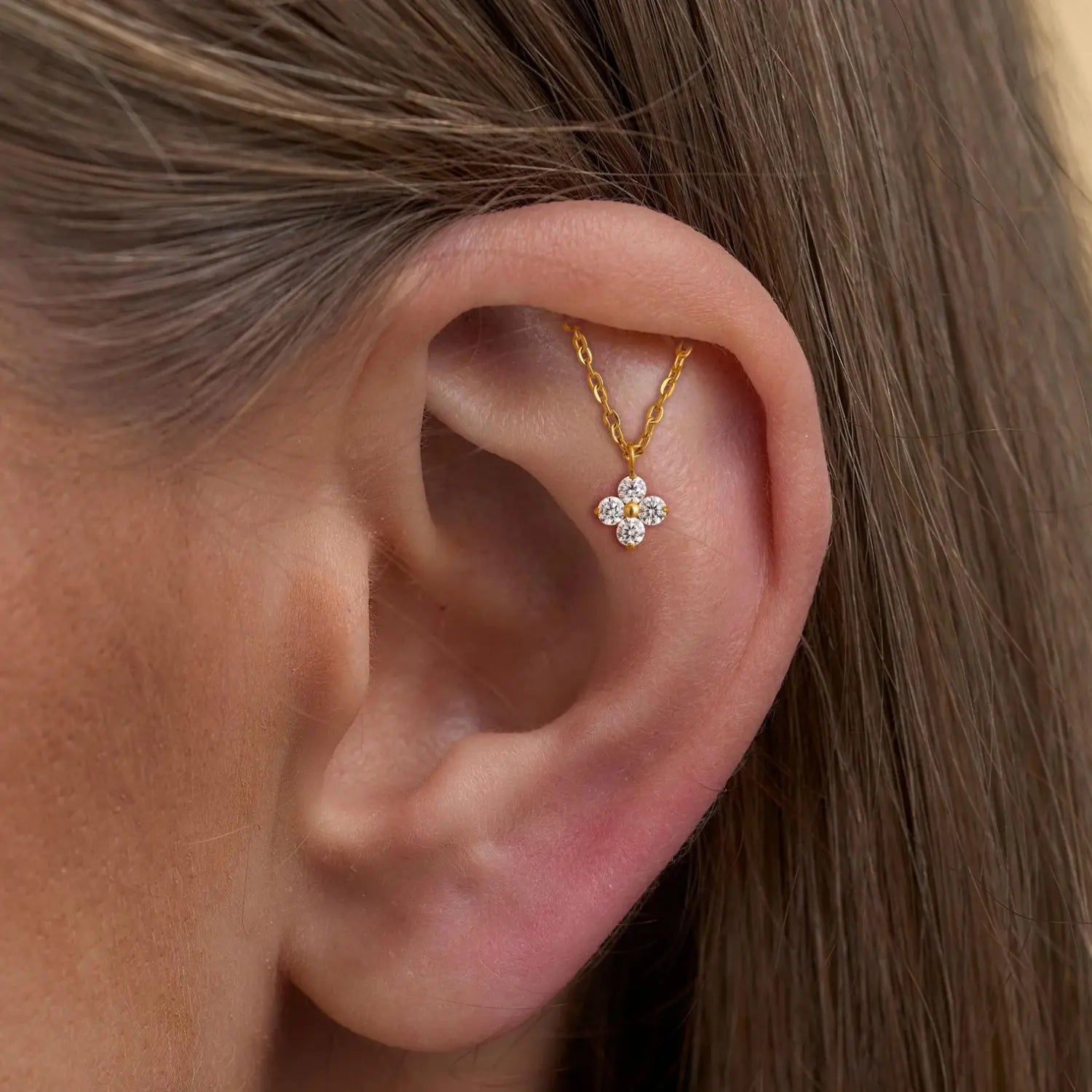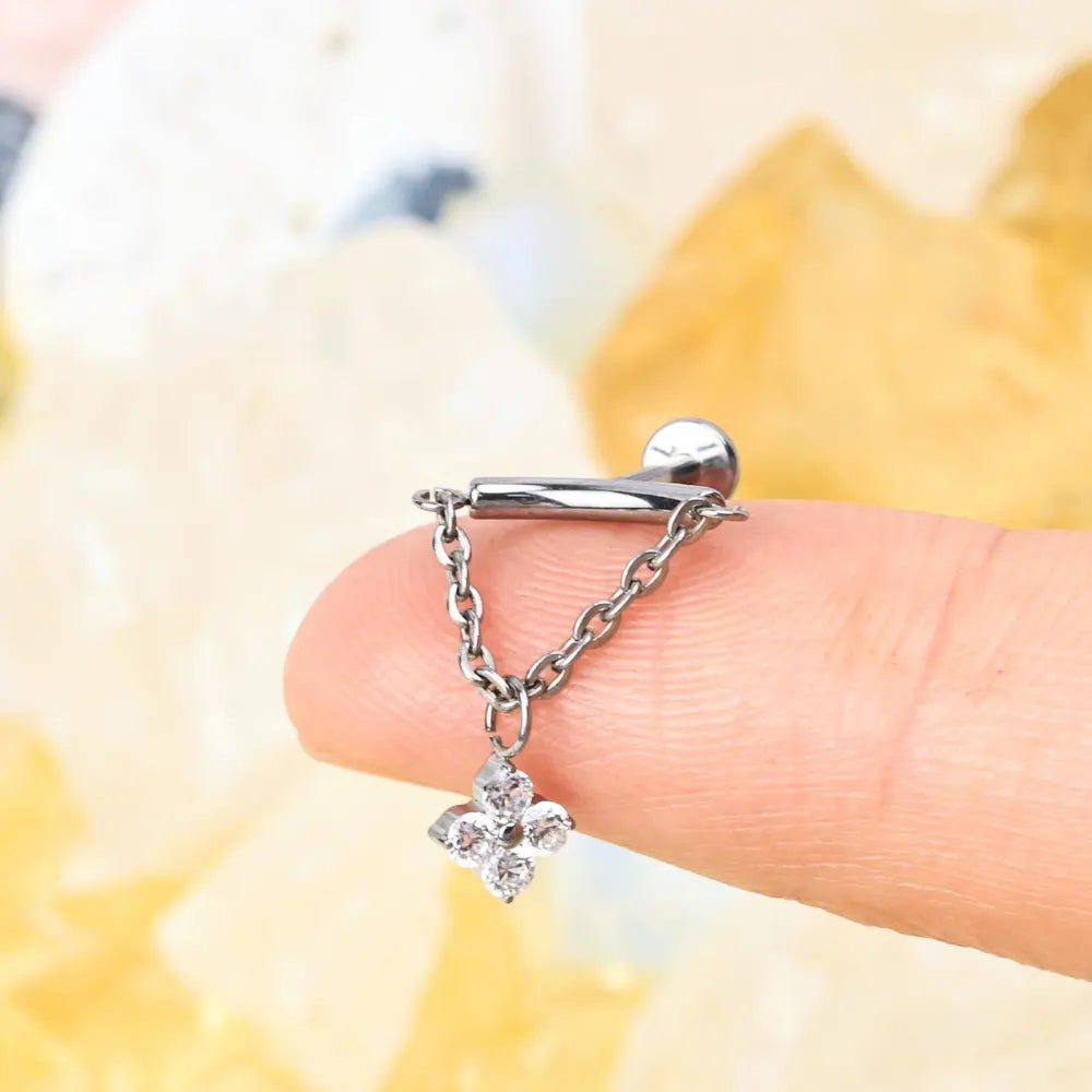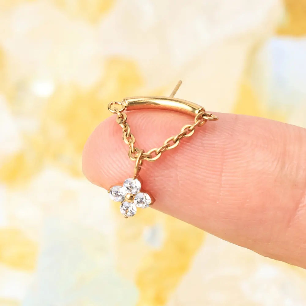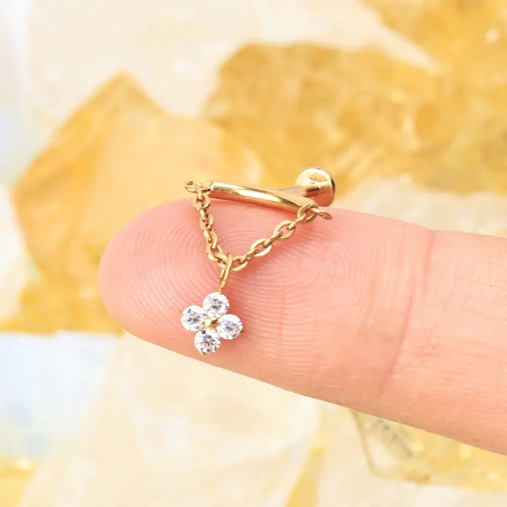 A little luck, a lot of charm — the Amiria Stud features a delicate four-leaf clover charm that gently dangles from a flat back post, bringing movement and meaning to your vertical helix or hidden rook piercing.