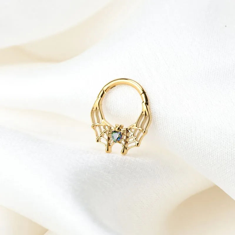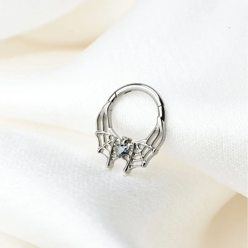 Crafted from implant-grade titanium, it features a dark iridescent gemstone that shimmers with subtle hues, it evokes mystery and depth from every angle. Set within an intricate spider design, this beuatiful piece symbolizes creativity, transformation, and feminine strength.