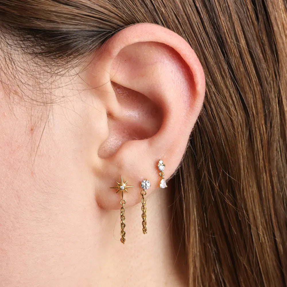 Elevate your ear stack with this feminine and modern design. Made for a single piercing, this stud features a sparkling solitaire diamond with a delicate dangling chain that sways gracefully with every movement. Crafted from durable implant-grade titanium and finished with your choice of 18K real gold plating or platinum plating, it’s both safe for most sensitive skins and luxuriously elegant. The push-pin flat-back design ensures a secure, comfortable fit—perfect for everyday wear with a touch of glamour.