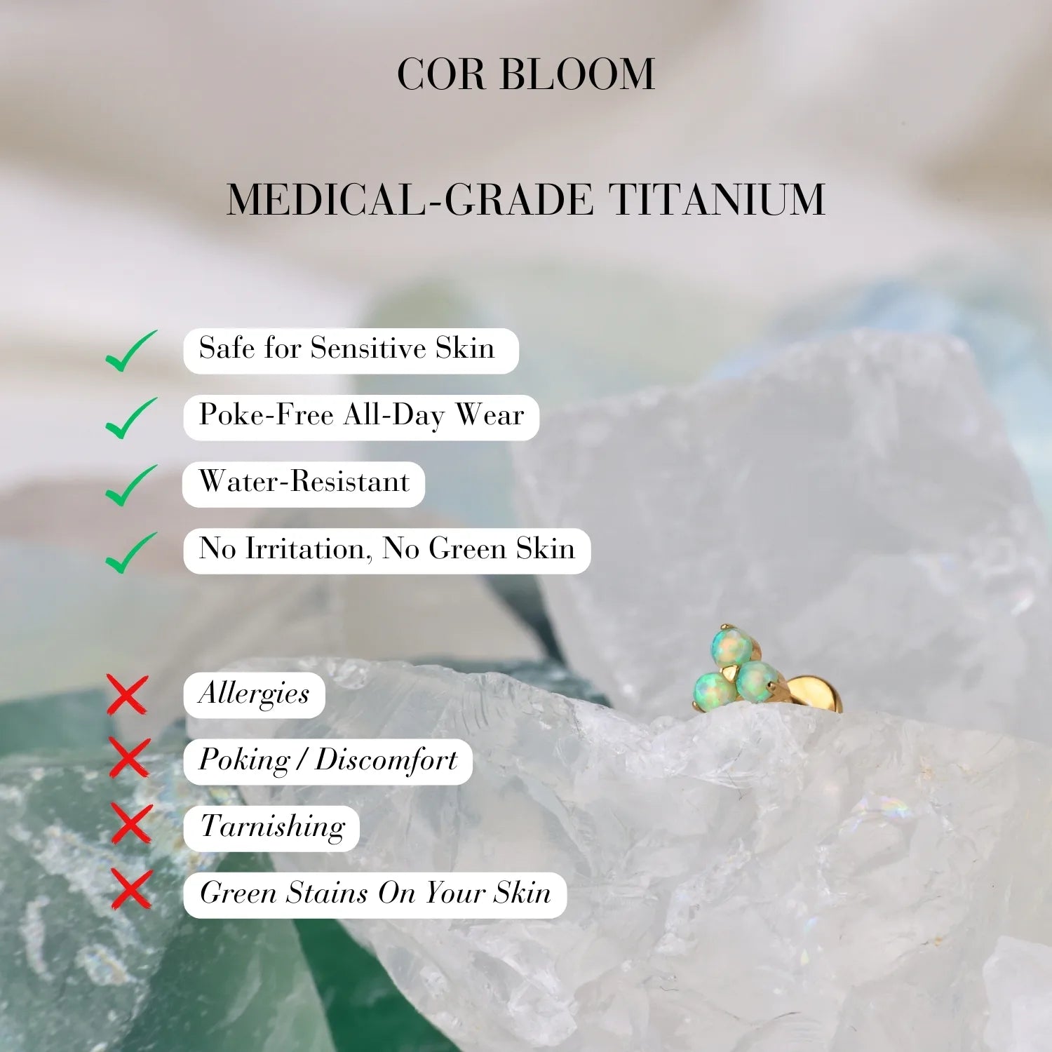 At Cor Bloom, our Titanium Jewelry is meticulously crafted to be water-resistant, offering you the freedom to wear it confidently near water. Nevertheless, to uphold its pristine appearance over time, we advise minimizing prolonged exposure to water, chemicals, moisture, chlorinated water, and cleansing products. By following these care instructions, you can help ensure that your jewelry retains its beauty and longevity for years to come.