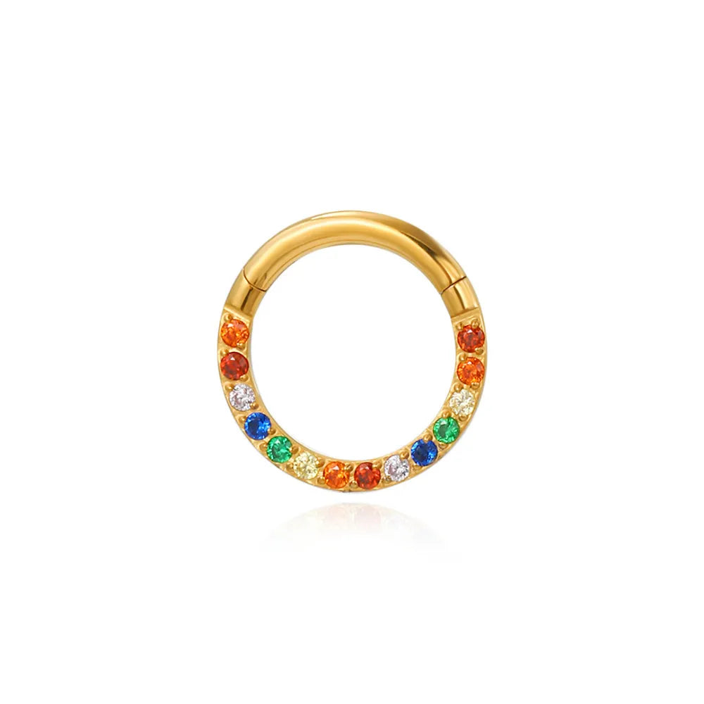 Add a pop of color to your piercings with our Titanium Multicolor Gemstone Rainbow Clicker! This beautiful clicker ring is perfect for septum, daith, and cartilage piercings. Show off your unique style with this playful and colorful accessory!