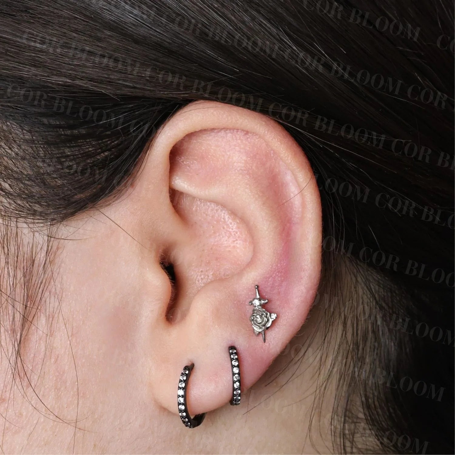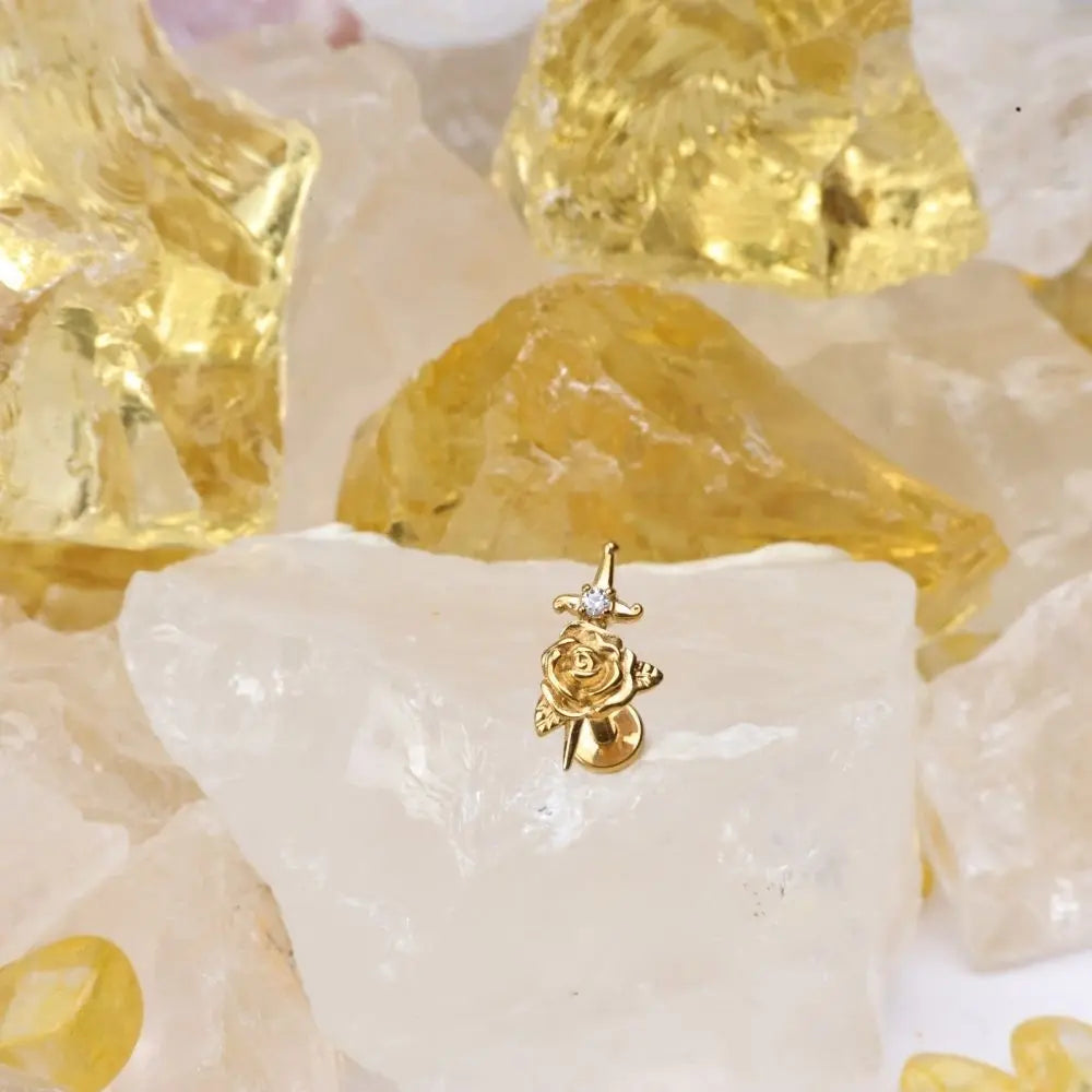 Unleash your inner warrior with our Titanium Sword and Rose Flat Back Stud. Crafted with intricate details, this premium piece features a sword and rose design that exudes strength and beauty. Made with durable titanium, this stud is built to last. A must-have for any daring and stylish individual. (It's swordy and flowery for those who like to slay in style! 🗡️🌹)