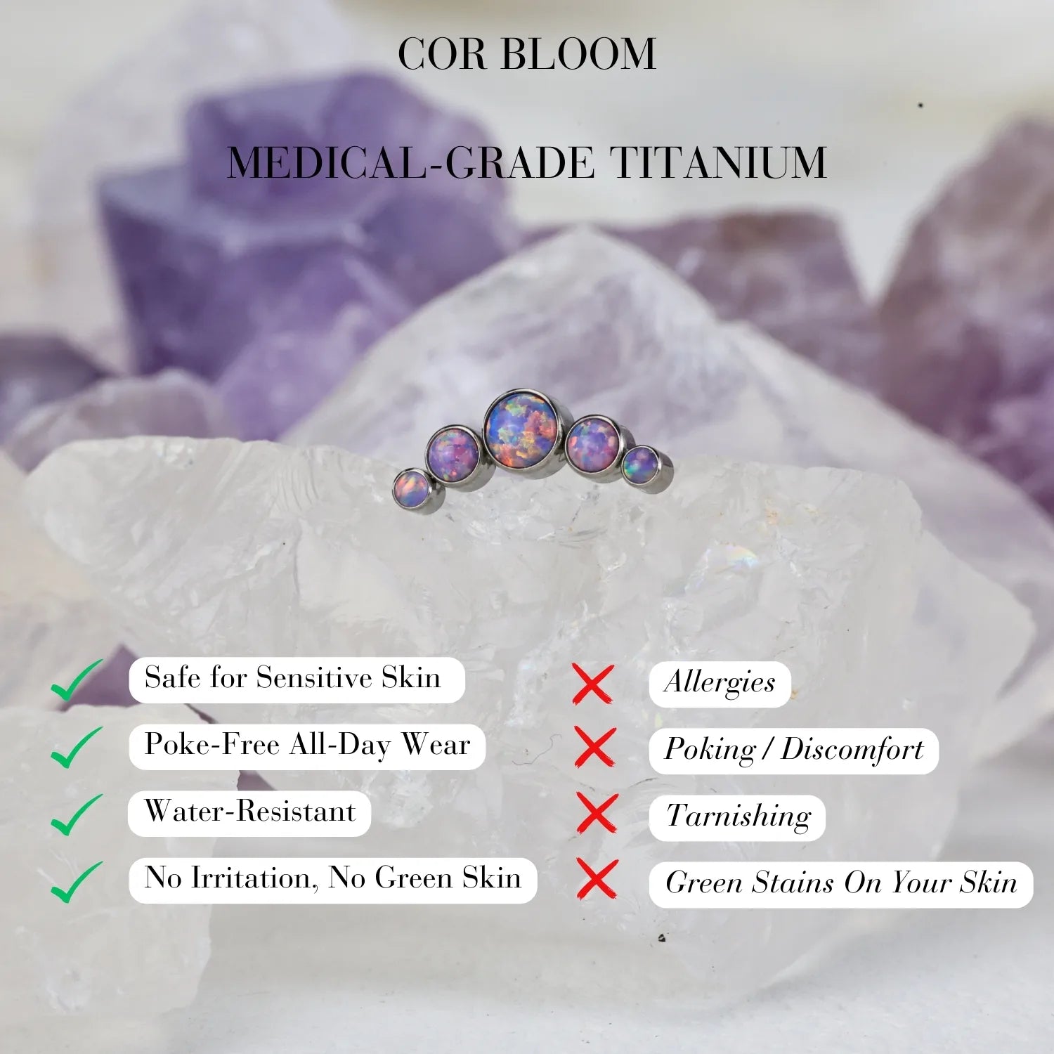 Elevate your style with our Titanium Violet Flame Opal Climbing Helix Piercing Earring. Adorned with 5 stunning violet flame opal stones, this climber piercing adds a touch of beauty and meaning. Perfect for cartilage or conch, this piece exudes elegance and sophistication. Dare to be stylish and unique with this exclusive earring.