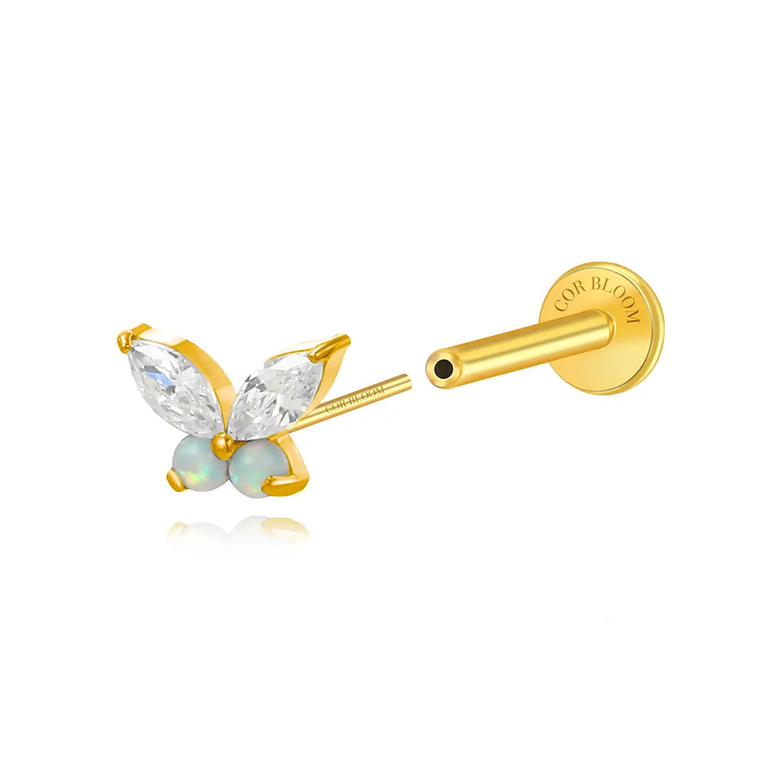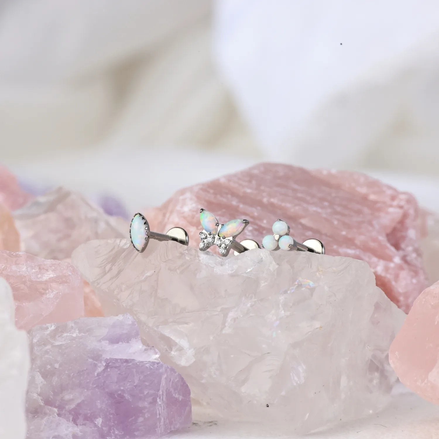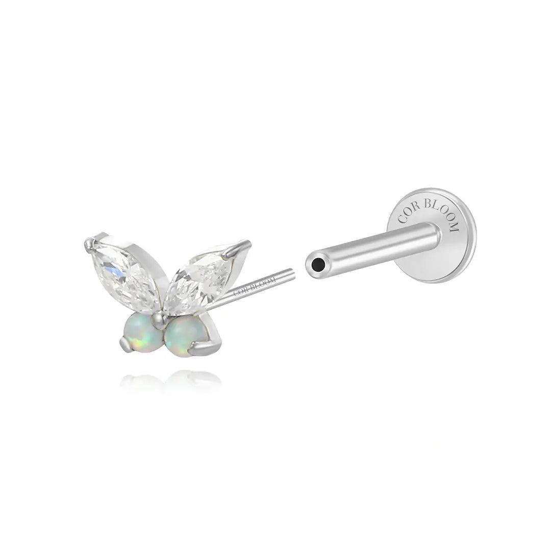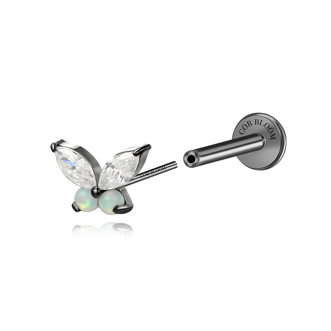An exquisite white opal butterfly, radiating elegance and femininity, crafted with precision from medical-grade titanium to ensure both beauty and safety. This delicate piece boasts an extra shine, adding a touch of glamour to your collection of accessories.