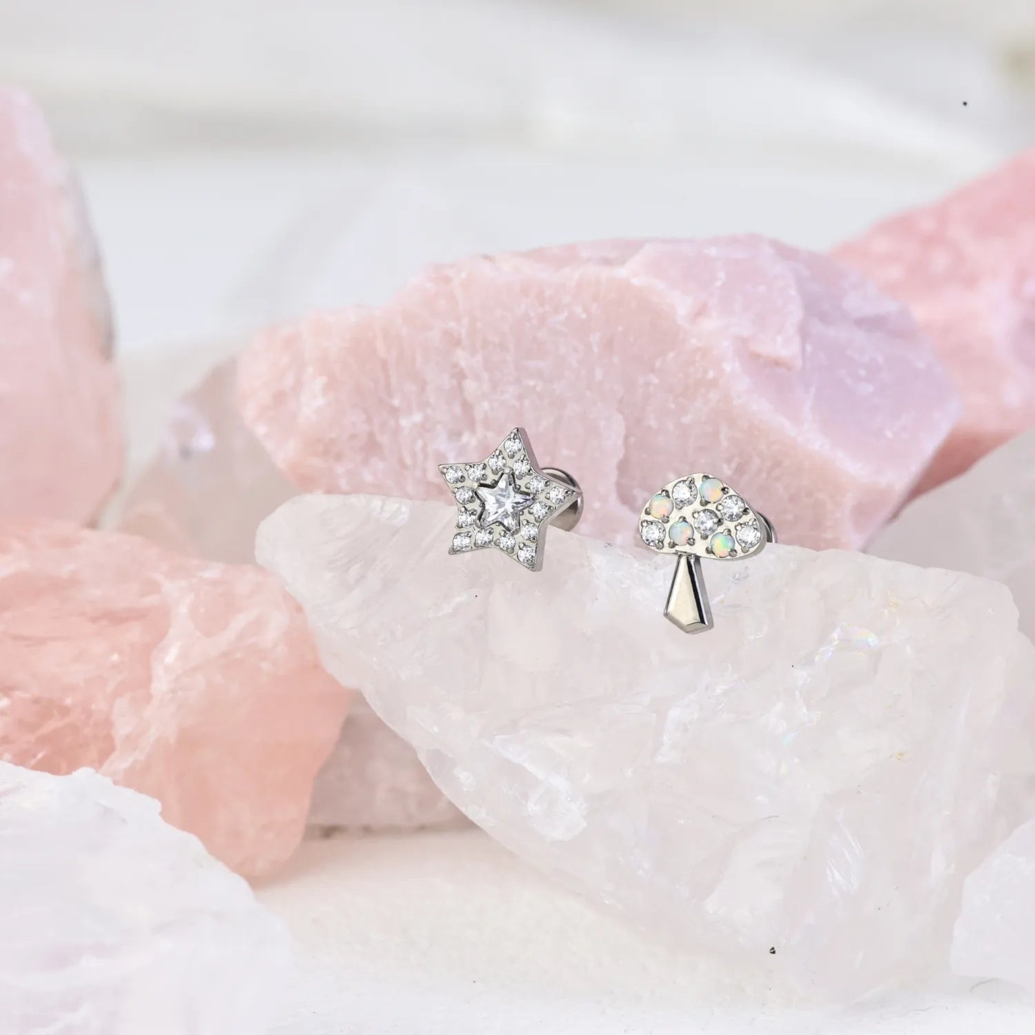 A truly distinctive masterpiece – a whimsical design featuring a charming mushroom adorned with sparkling cubic zirconia and white opal stones in a pave setting. This particular creative piece exudes a playful elegance that sets it apart in the world of body jewelry. Looking for a special piece to show your personality, this is the one for you!
